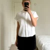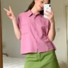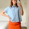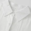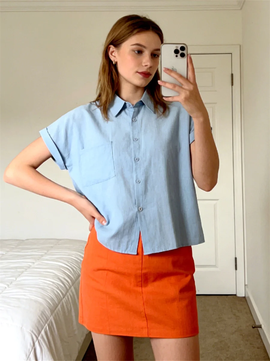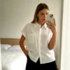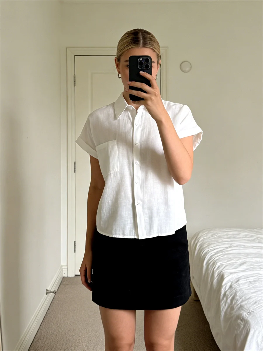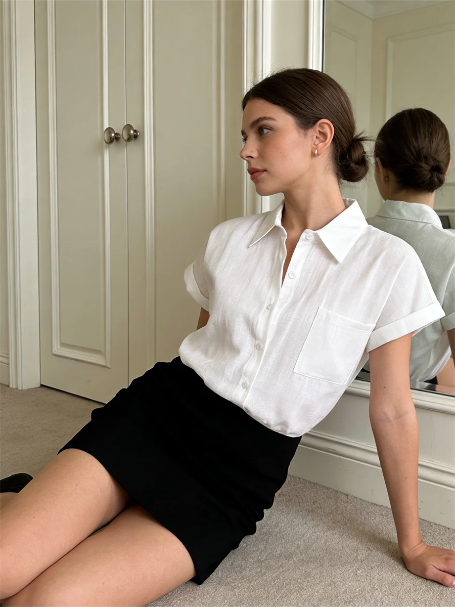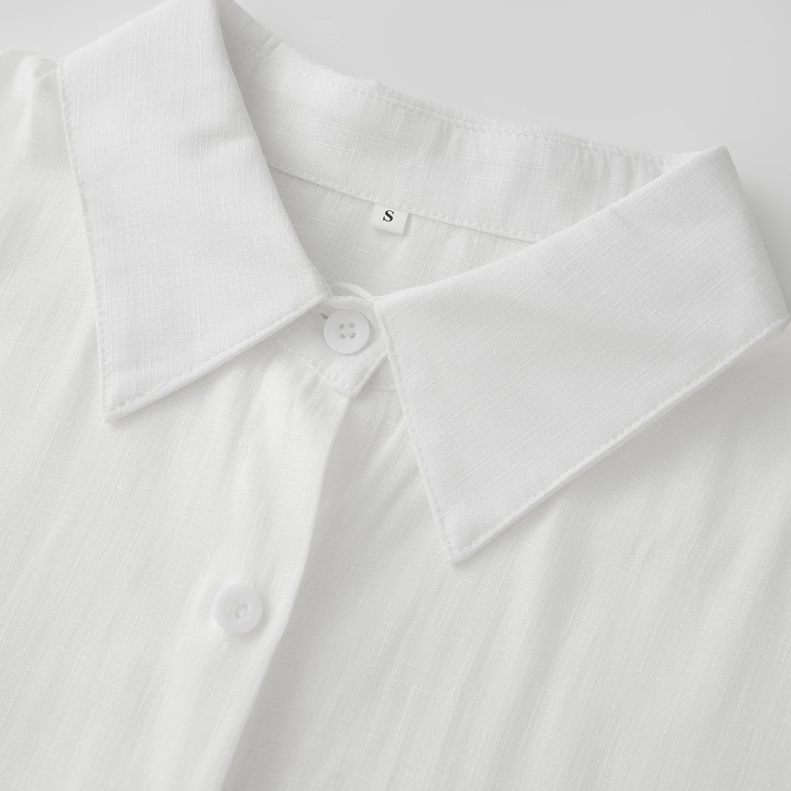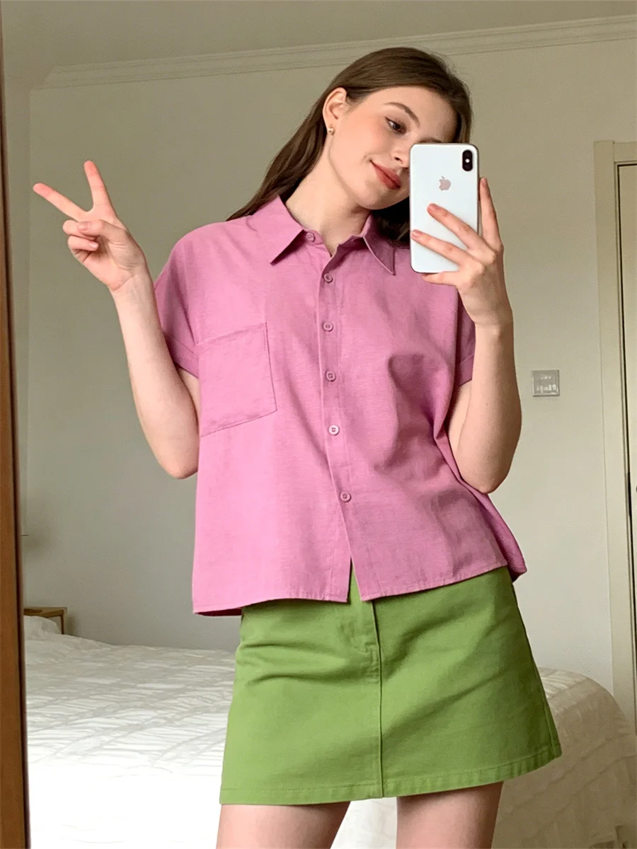 Summer Women’s Shirts Cotton Linen Short Sleeve Lapel Button Up Tops Solid Color Blouses with One Pocket